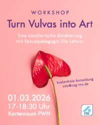 Der Workshop richtet sich an Erwachsene: Besitzer*innen von Vulven und ihre Verbündeten, Eltern, Fachkräfte aus Bildung, Beratung, Medizin, Therapie oder Sozialer Arbeit und alle anderen, die sich dem Thema künstlerisch annähern wollen.